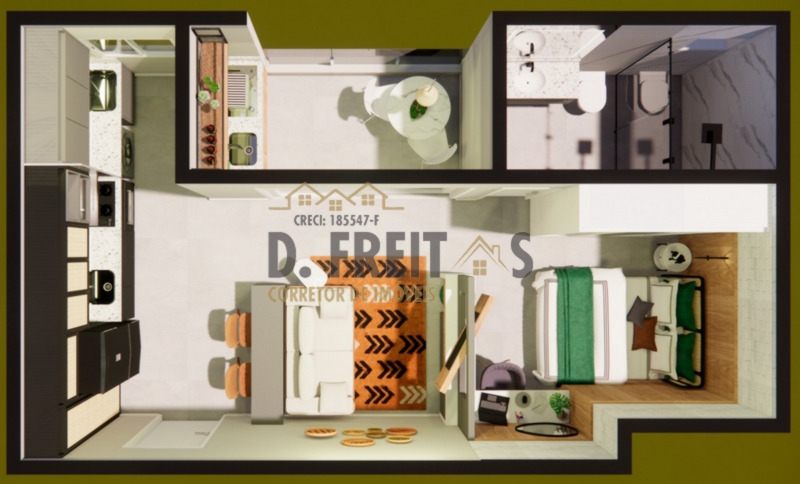 CONTENDO: 01 DORMITÓRIO, SALA, COZINHA, BANHEIRO, ÁREA DE SERVIÇO E 01 VAGA COBERTA DE GARAGEM